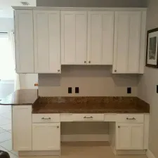 We removed the doors and drawers. Then we sanded and cleaned to prep for painting. We applied bonding primer and multiple coats of Chem Craft Satin Finish cabinet lacquer. Finally, we re-assembled the cabinets.